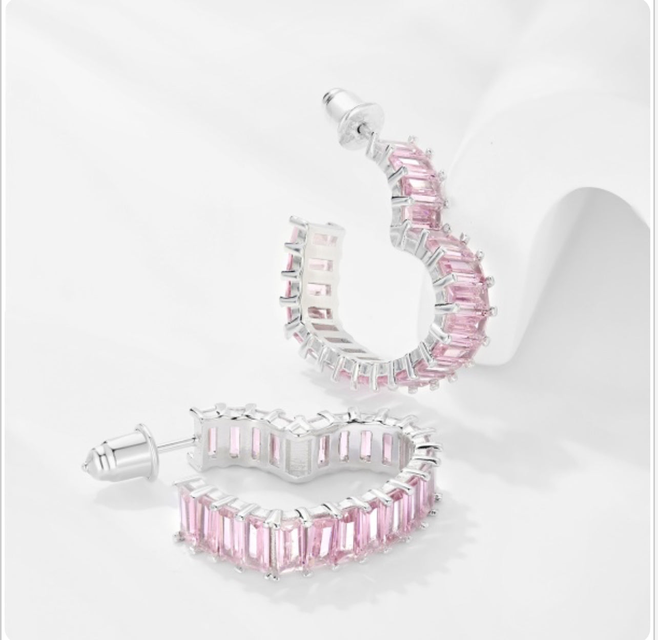 Introducing our Radiant Baguette Hoop Earrings, available in both a lustrous silver-tone with enchanting pink crystals and a classic gold-tone adorned with clear crystals. These hoops are a modern twist on timeless elegance, featuring a continuous loop of meticulously matched baguette-cut stones, offering an uninterrupted cascade of sparkle. The design marries the boldness of geometric precision with the delicate art of jewelry-making.