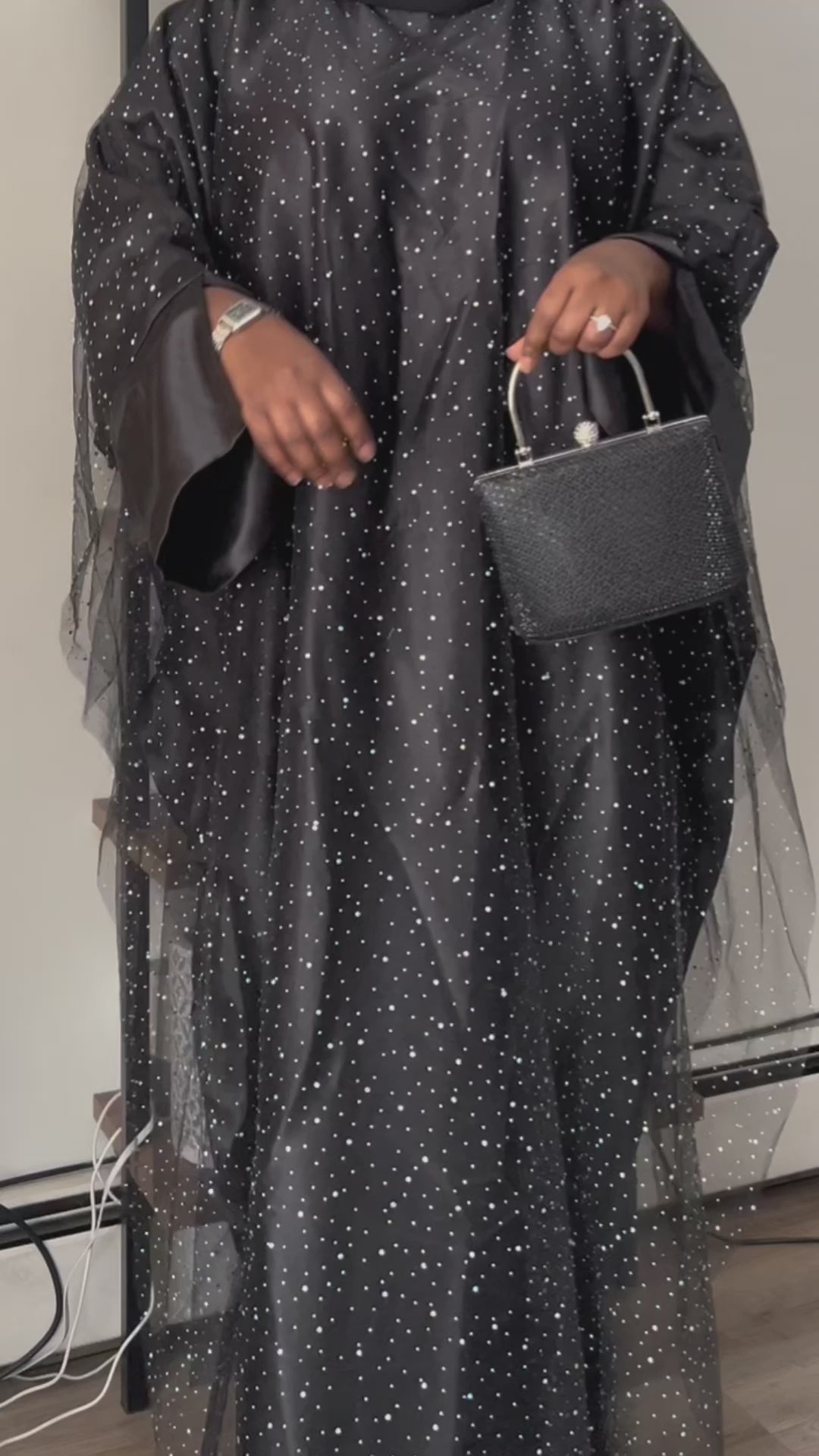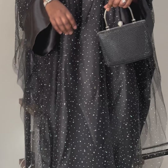 The Tasneem Abaya is elegance in its purest form—designed for the woman who loves simplicity with a touch of sparkle. This closed-style abaya features a flowy silhouette crafted from high-quality satin, layered with rhinestone-embellished tulle for a soft shimmer that catches the light effortlessly. It includes a matching hijab, making it the perfect ready-to-wear Eid ensemble.